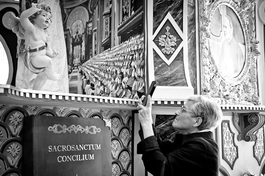 Once the prize possessions of angels or mock doric columns have been torn off and claimed, the rules of the game allow recapture within a certain circumference. Organised into gangs that hone in on the primo treasures and then pass them down to eager accomplices, the loot is quickly divvied up and carted off. Not everyone gets the biggest piece of a wedding cake. The telly zooms in on the late comers descending upon the chariot remnants as a lowly staircase gets eviscerated by the hungry. In an unconscious touch of fairness, a treasured headless apostle floats by along the intended route as the victorious parade fresh relics across the piazza for our admiration.
