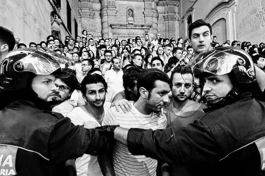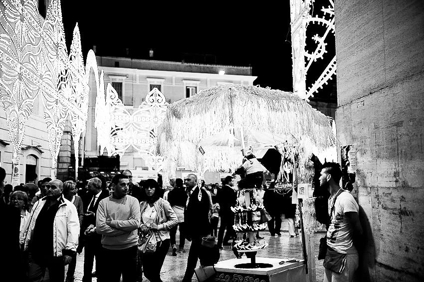 Up to date as only design conscious southern Italy can manage, the developments are now televised on three screens including one on the main piazza above the historic cisterns that remind one that this may be the oldest city in Europe. We thus witness the retreat of the cavalry twice; once on screen and then moments later al fresco as they trot through the hordes back along the residual pathway of their first appearance. At the last moment four less quirky, blinkered mules have been ushered into place at the head of the chariot. Their driver strapped in, the carro performs the mandatory three ritual circles in yet another crowded piazza, before aligning itself with the canyon to come. The evening’s raison d’être involves running the gauntlet between those ravenous for loot. A body guard of blue helmeted police squads and the loyal followers of the local football team are tasked with getting the precious wagon past 120 meters prime retail outlets (fenced in for the occasion) and out before the awaiting masses on the piazza beneath the delicate dome of micro lights.